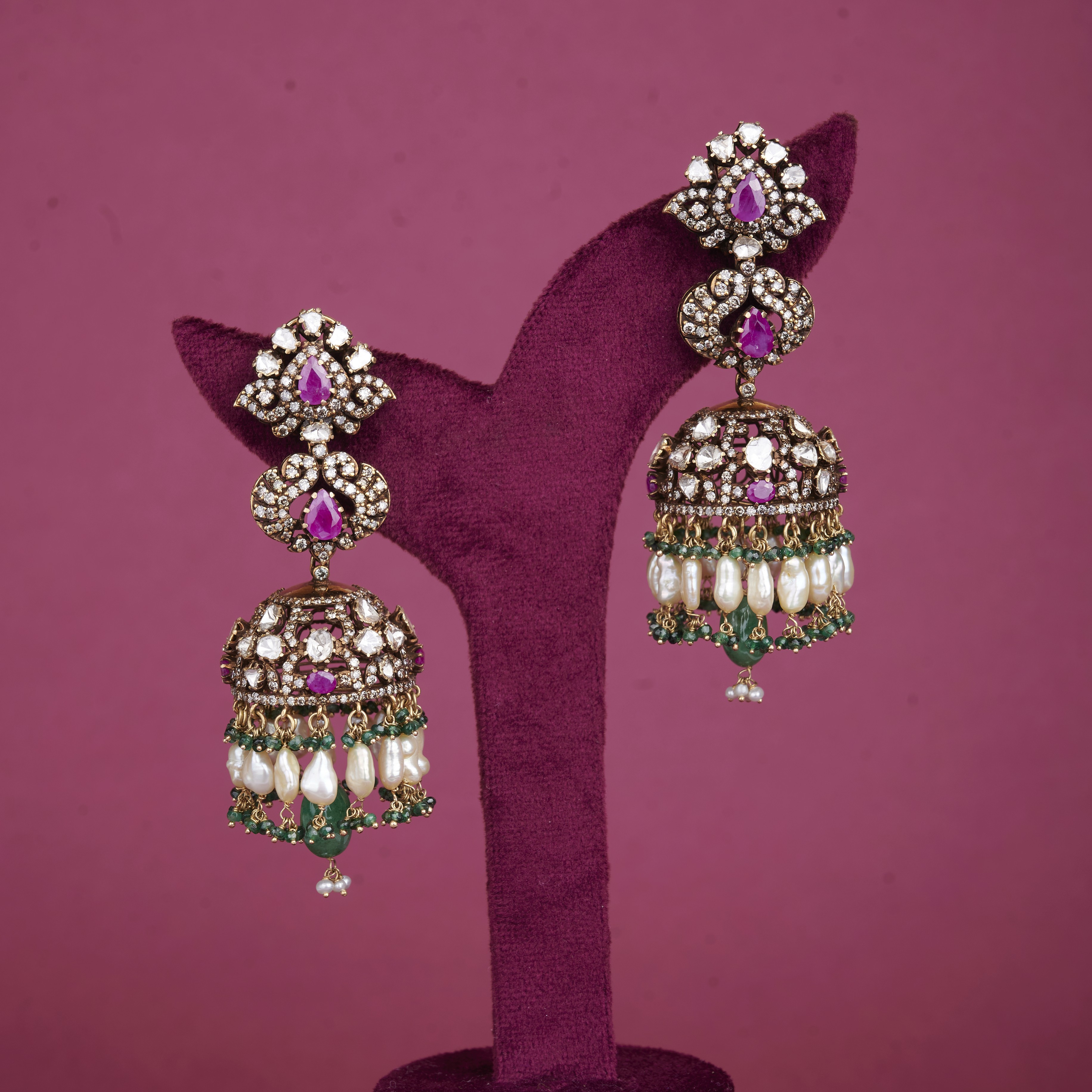 Our Diamond Polki Jhumkas feature intricate designs with precious stones, dangling pearls, and beads, adding a touch of elegance and charm. These earrings are perfect for elevating your look with their blend of traditional craftsmanship and modern style. Discover the luxurious beauty of these captivating jhumkas today.