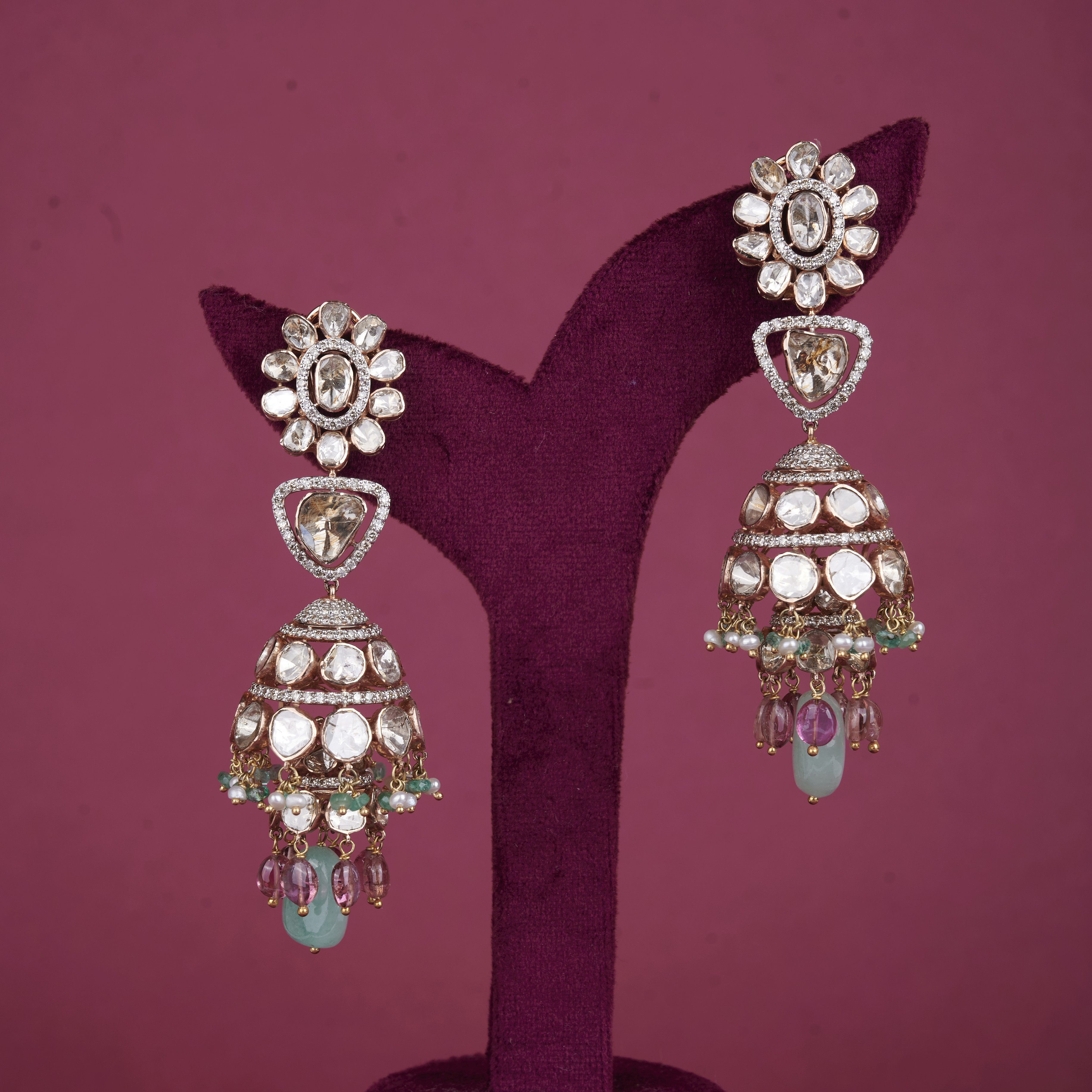 Explore elegance with our Pastel Stone Pearl Diamond Jhumkis, featuring delicate pastel stones, shimmering pearls, and sparkling diamonds. These earrings blend traditional charm with modern sophistication, perfect for adding a touch of grace and glamour to any occasion. Discover the exquisite beauty and craftsmanship of these stunning jhumkis today.