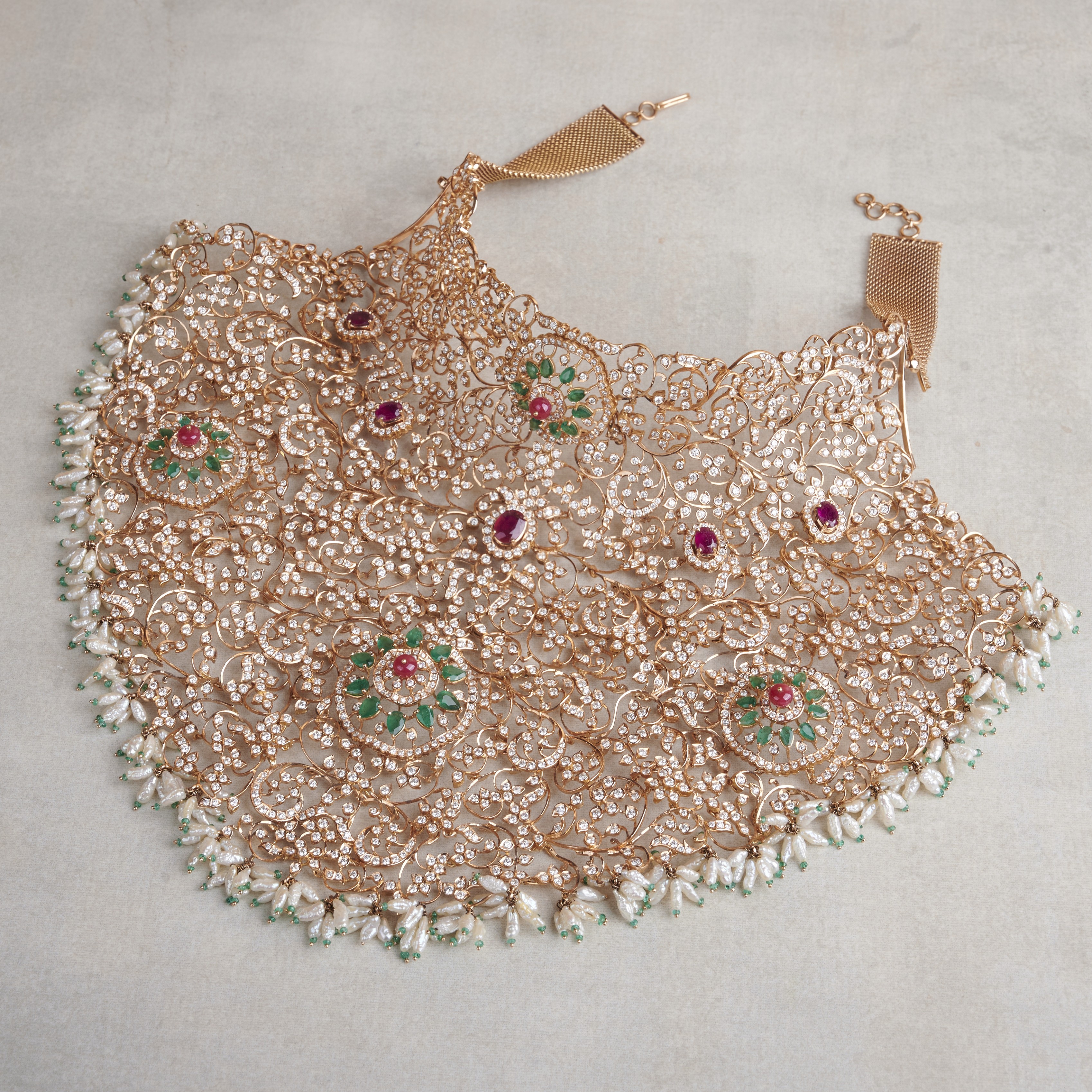 Introducing the Emerald Blossom Diamond Necklace, a stunning fusion of diamonds, emeralds, dangling pearls, and precious stones in intricate floral motifs. This exquisite necklace is a true testament to luxury and craftsmanship, perfect for those who appreciate fine jewelry with a touch of botanical elegance. Ideal for weddings and special occasions, it captures the essence of natural beauty and sophistication, promising to dazzle and enchant wherever it's worn. Embrace the allure of timeless design and exceptional gemstones with this extraordinary piece that exudes elegance and charm.