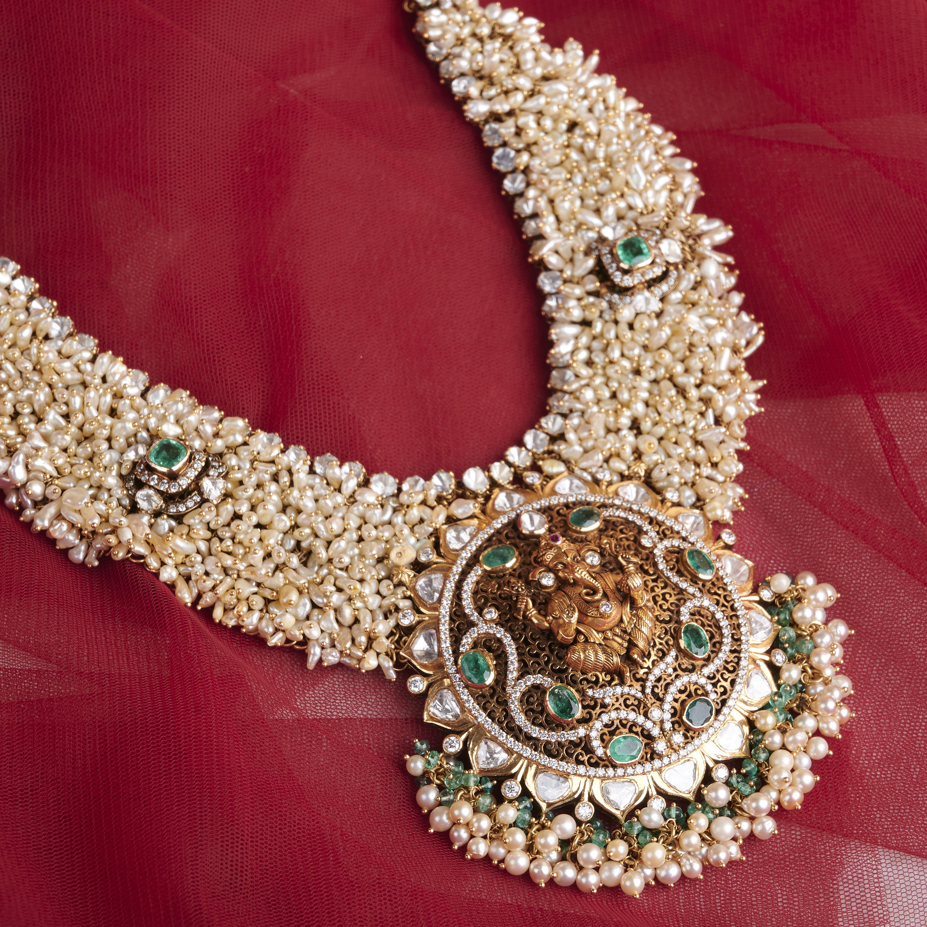 The Ganesha Pearl Elegance necklace features a stunning Ganesha pendant surrounded by a string of lustrous pearls and delicate dangling beads. This exquisite piece combines spirituality and elegance, perfect for adding a touch of divine beauty to any outfit. Ideal for both special occasions and everyday grace.