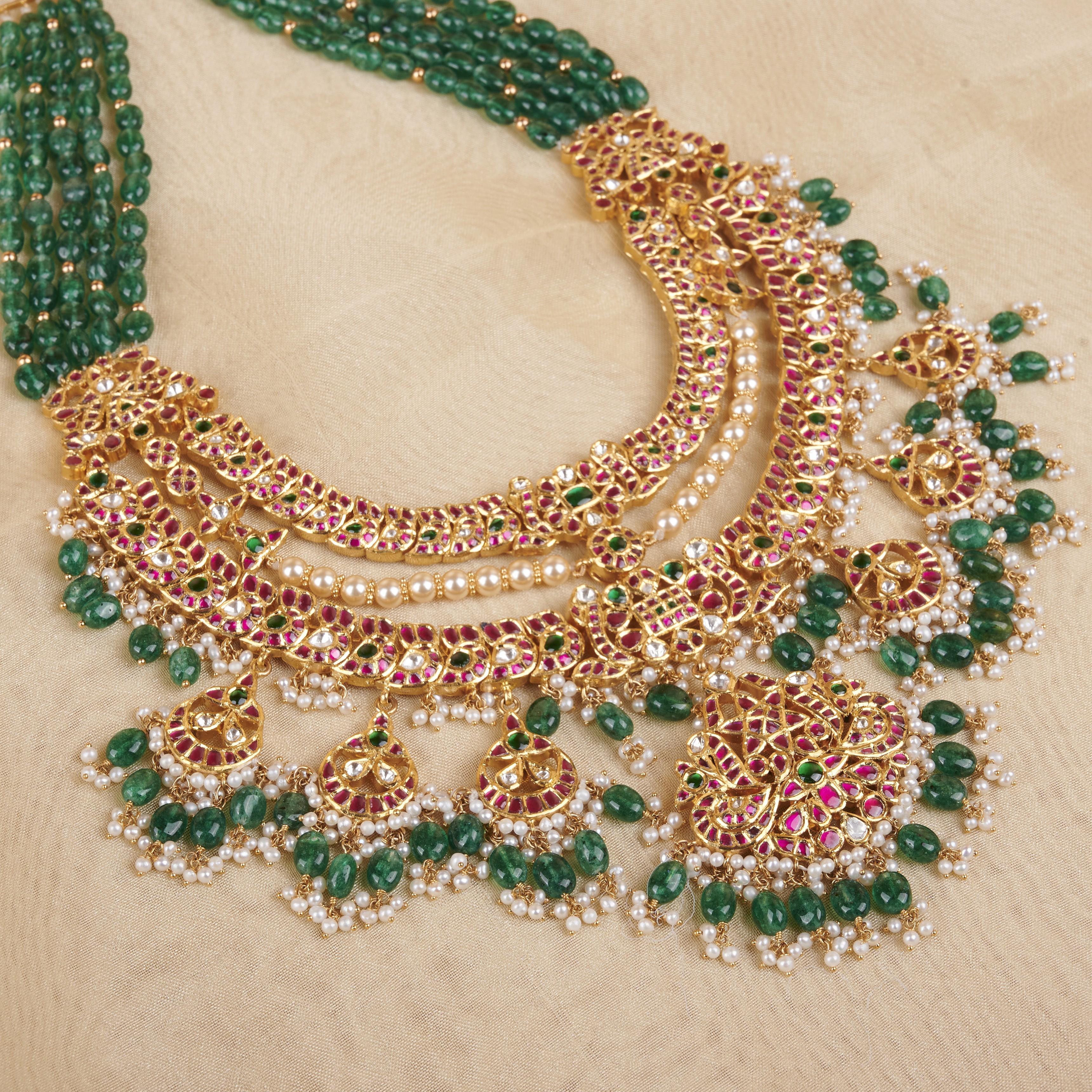 Elevate your style with our Polki Pearl Cascade Layered Necklace, a masterpiece of elegance and craftsmanship. Featuring layers of dazzling Polki diamonds intertwined with lustrous pearls and dangling beads, this necklace exudes luxury and sophistication. Ideal for formal events or adding a touch of glamour to any outfit, it's a must-have for those who appreciate exquisite jewelry that makes a statement.