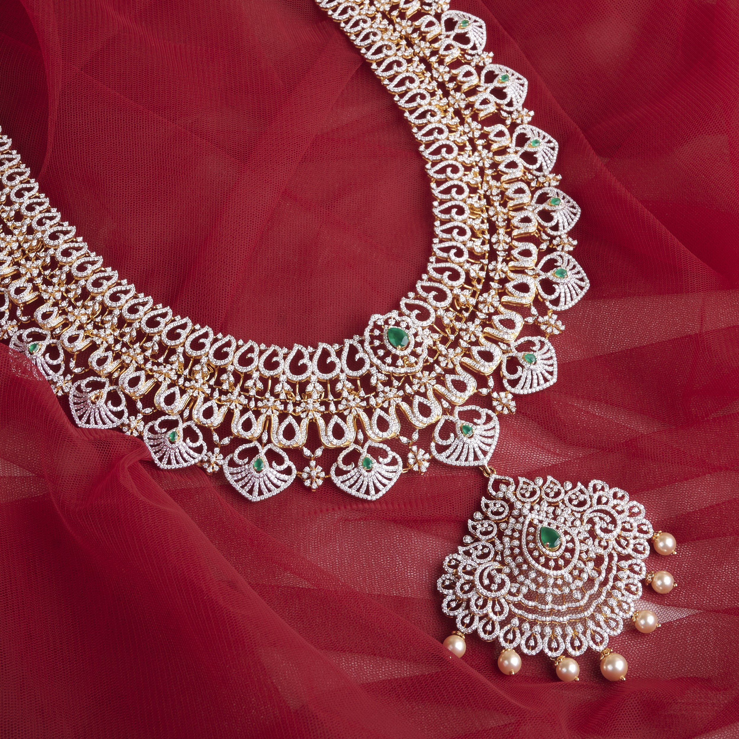 The Radiant Gem Majesty necklace boasts a stunning pendant adorned with radiant diamonds and rich emeralds. This piece exudes elegance and sophistication, ideal for enhancing any outfit with a touch of luxury and grace.