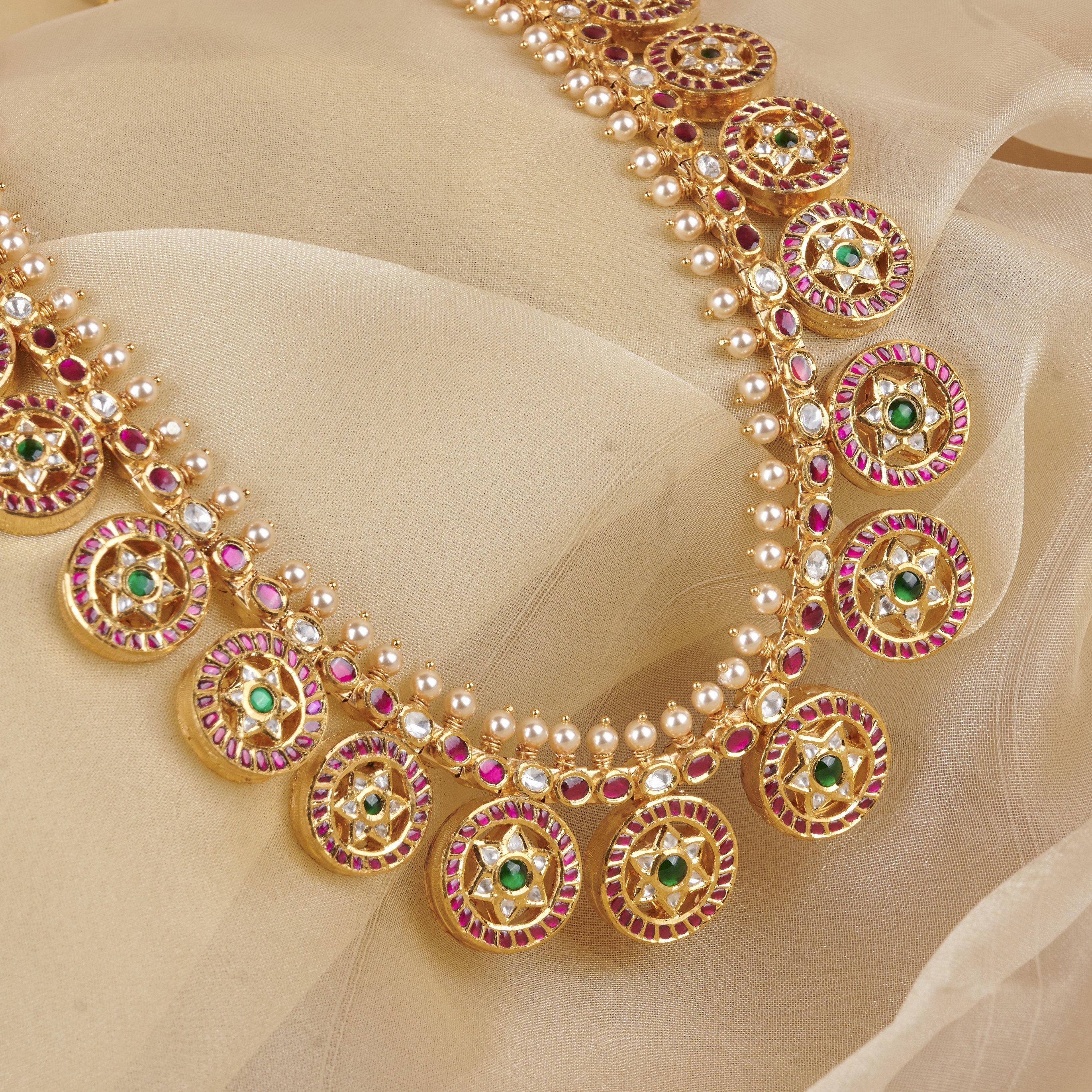 Experience regal elegance with our Royal Polki Pearl Circle Motif Necklace. This luxurious piece showcases intricate Polki diamonds, surrounded by lustrous pearls and classic circle motifs. Perfect for weddings and special occasions, this necklace is a statement of timeless beauty and sophisticated charm, designed to make you feel like royalty.